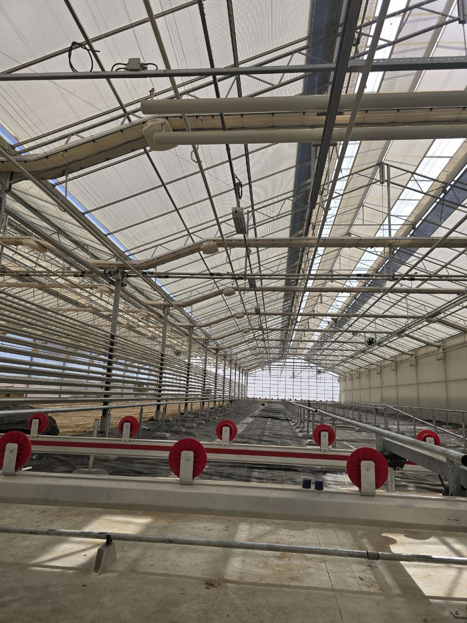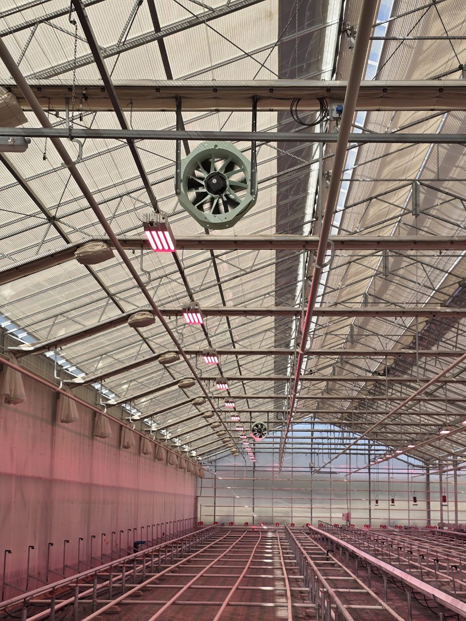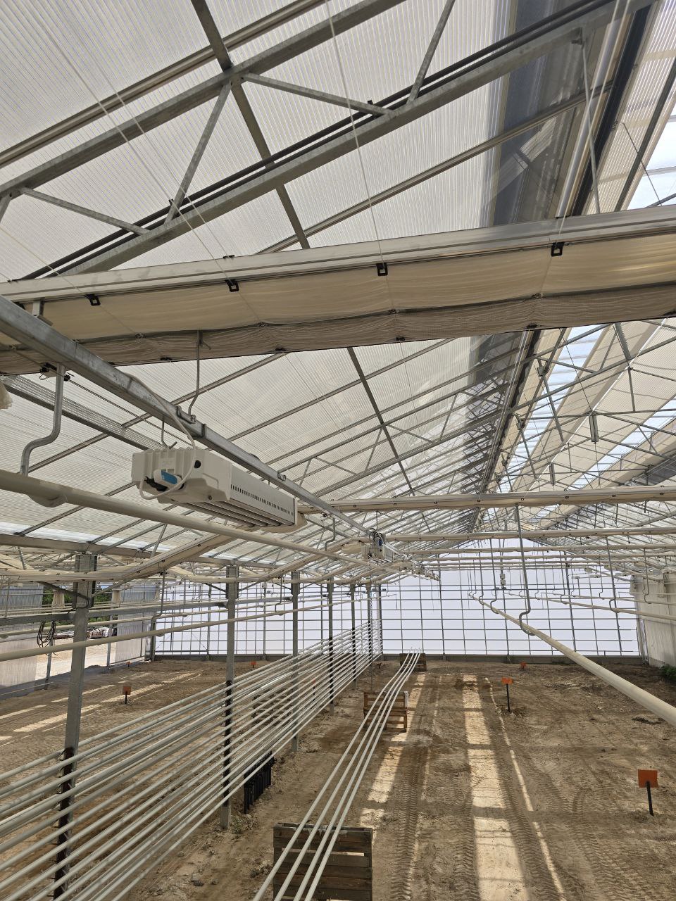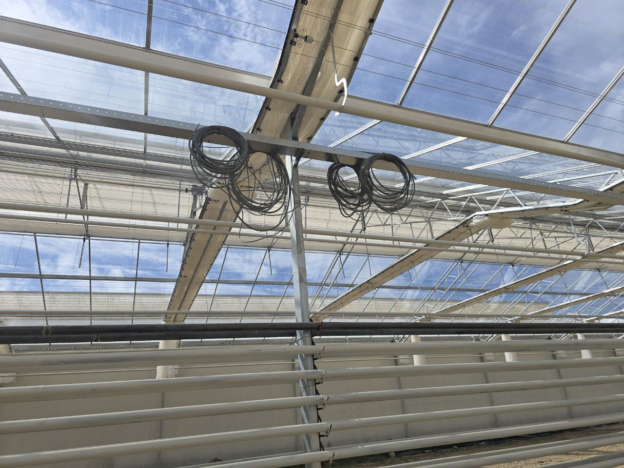 Electricity installation, including electrical panels, UV lights, sulphur evaporators, and motors. In addition, water installation, covering drainage, irrigation, and grow tables.